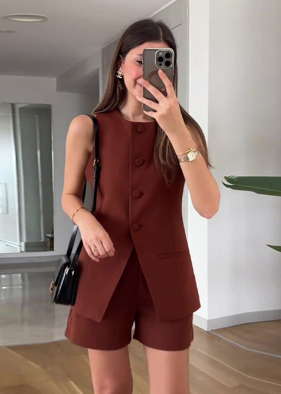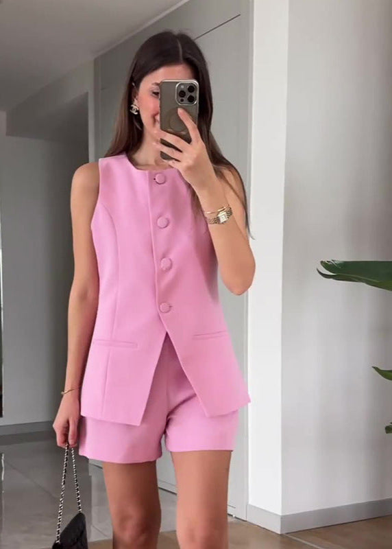 Crafted from a lightweight, breathable woven fabric, this outfit keeps you cool in the heat while maintaining structure and shape. The vest top features subtle darts and a flattering straight cut, while the shorts come with a soft inner lining and discreet zipper closure for that polished finish. The materials are chosen for their soft drape and durability, ensuring you stay chic and comfortable all day long.