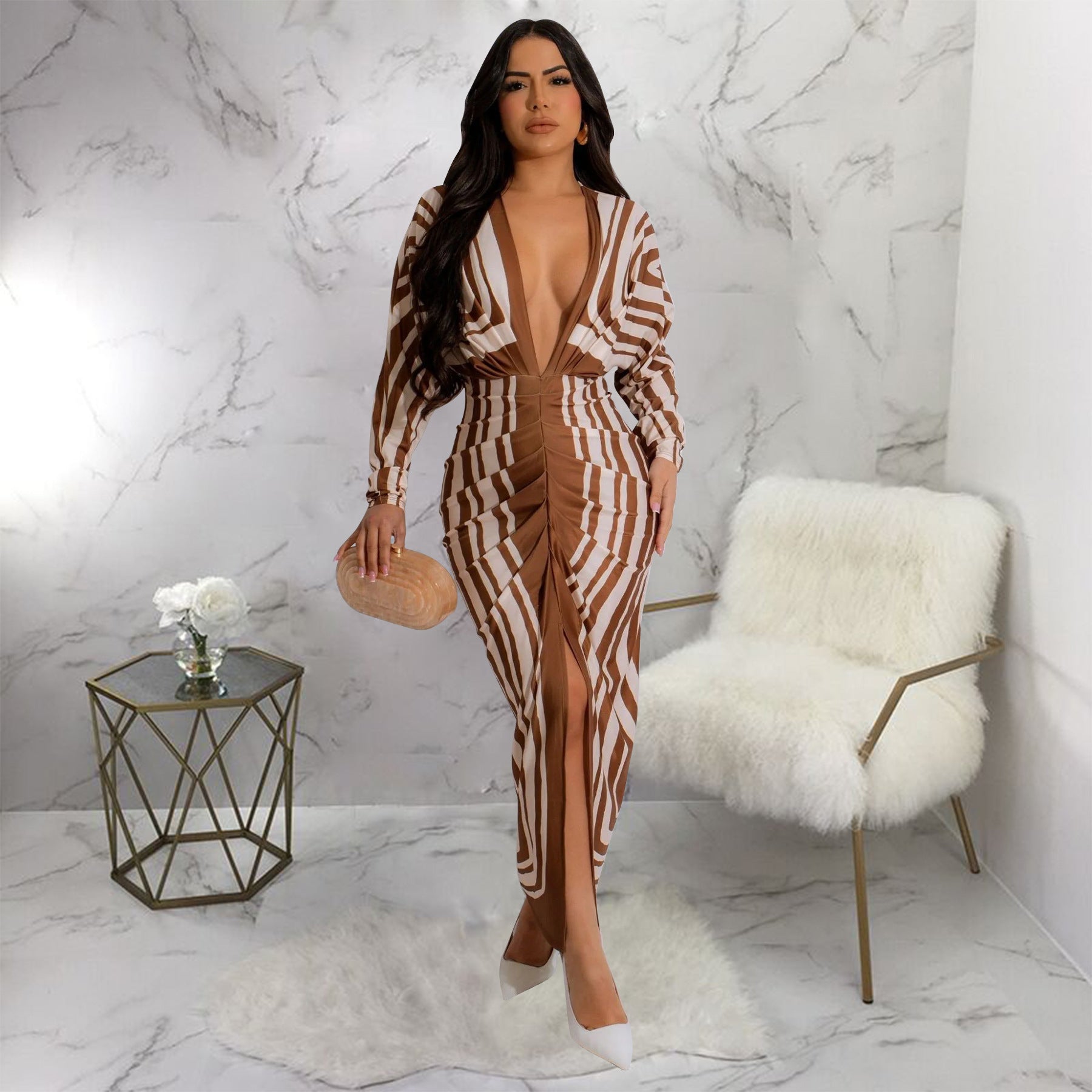 The deep V-neck design enhances your neckline and collarbone, while the high front slit adds a flirtatious touch, revealing just the right amount of skin. The long sleeves provide balance and elegance, making the overall silhouette both sensual and sophisticated. Combined with a cinched waist and flowing skirt, this dress creates a stunning hourglass effect that flatters every body type.